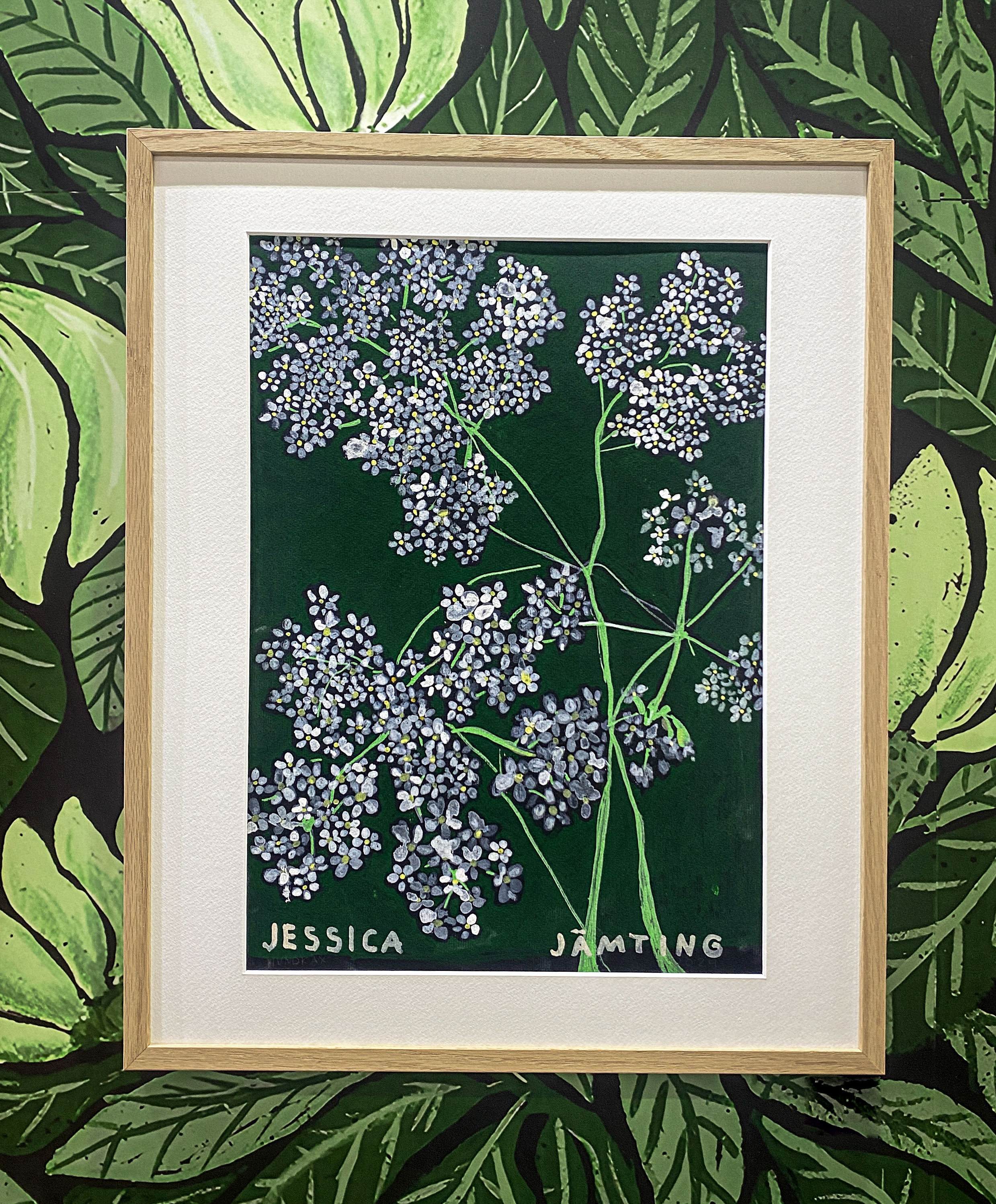 Ett poetiskt och stillsamt motiv av Jessica Jämting, där hundkäxens skira vita blommor breder ut sig som ett spetsmönster över den djupgröna bakgrunden. Ljuset fångas i de små kronbladen och skapar en känsla av lätthet och nordisk sommarstämning.