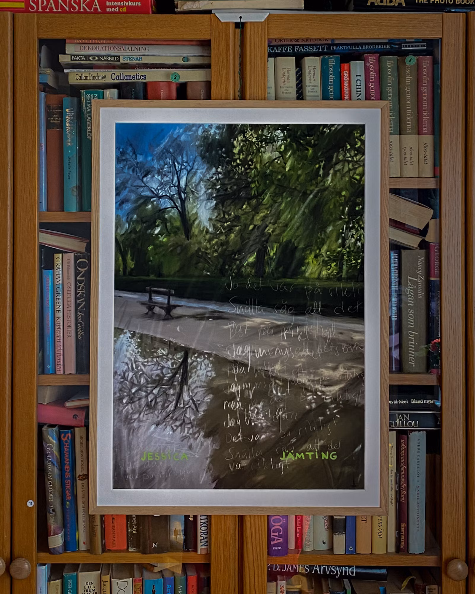 Una pintura onírica de Jessica Jämting. El motivo está inspirado en un día de primavera en el encantador Parque del Retiro en Madrid. La obra capta la atmósfera mágica del parque, donde la luz se filtra entre los árboles y se refleja en la superficie del agua.