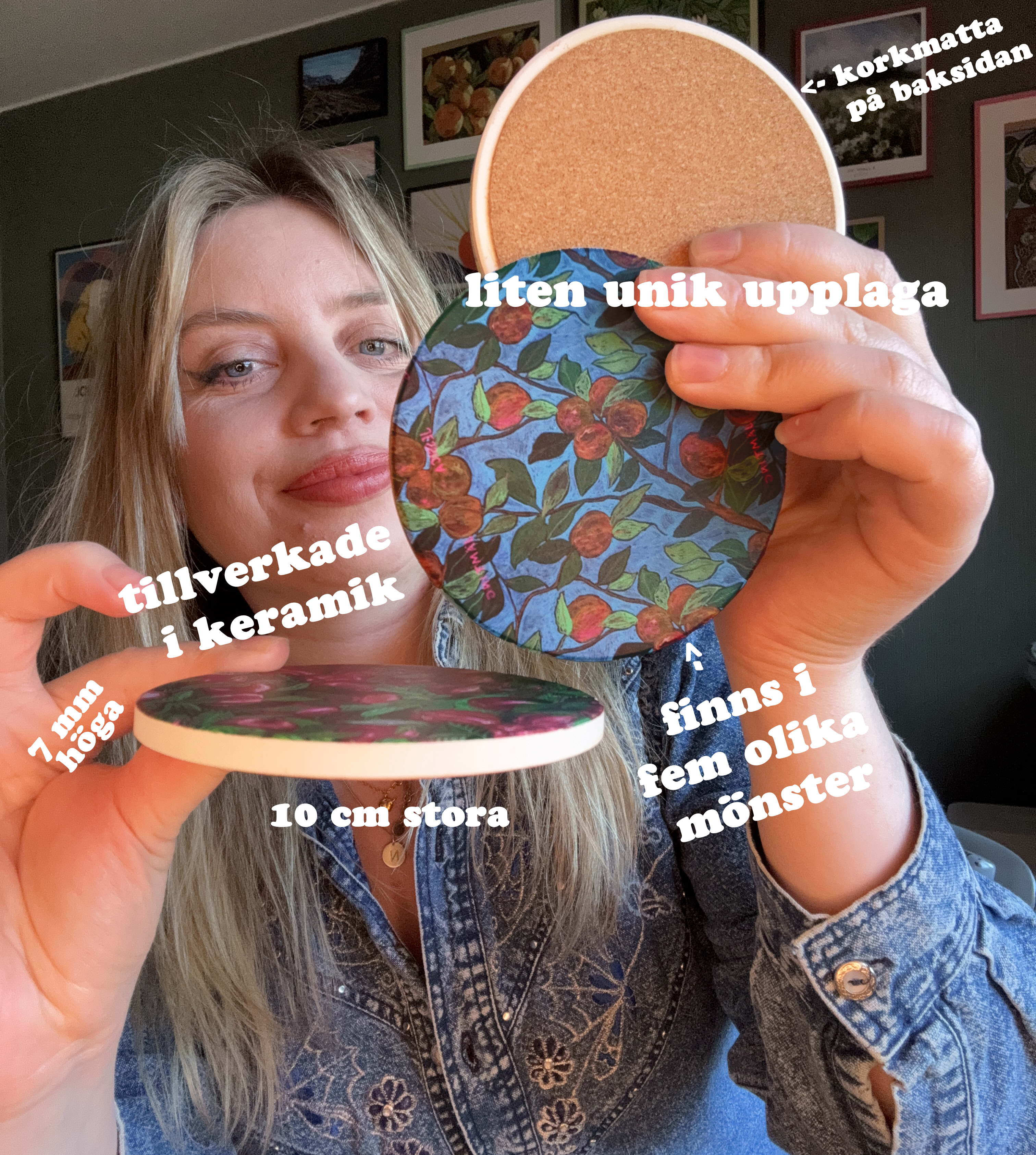 Ett härligt glasunderlägg i keramik i Jessica Jämtings mönster Äppelblom med korkmatta på undersidan.