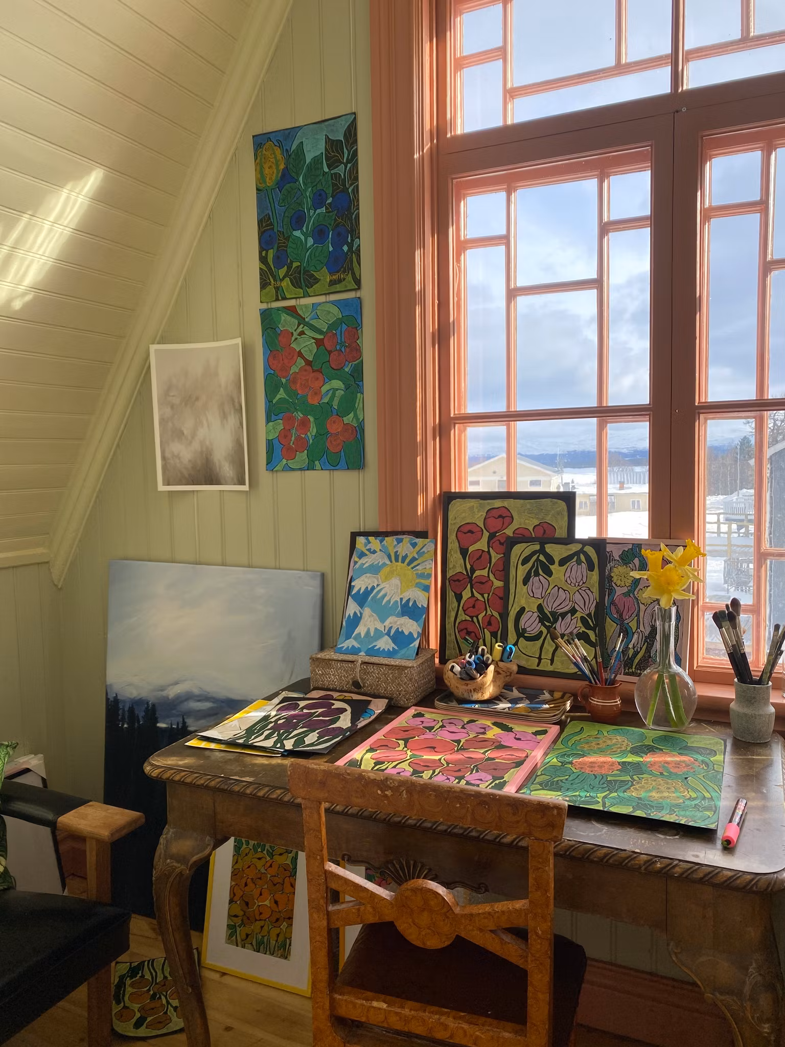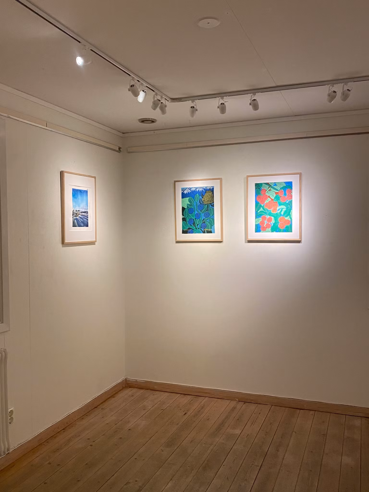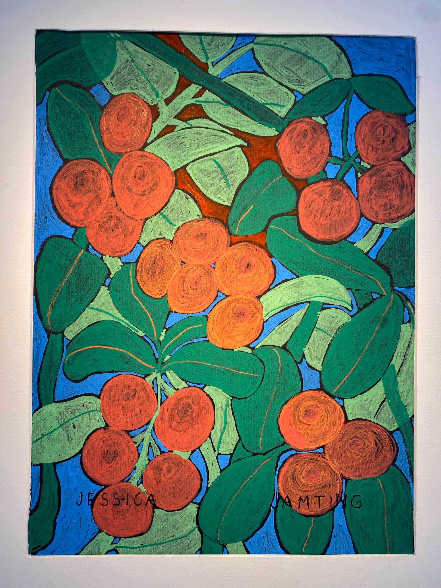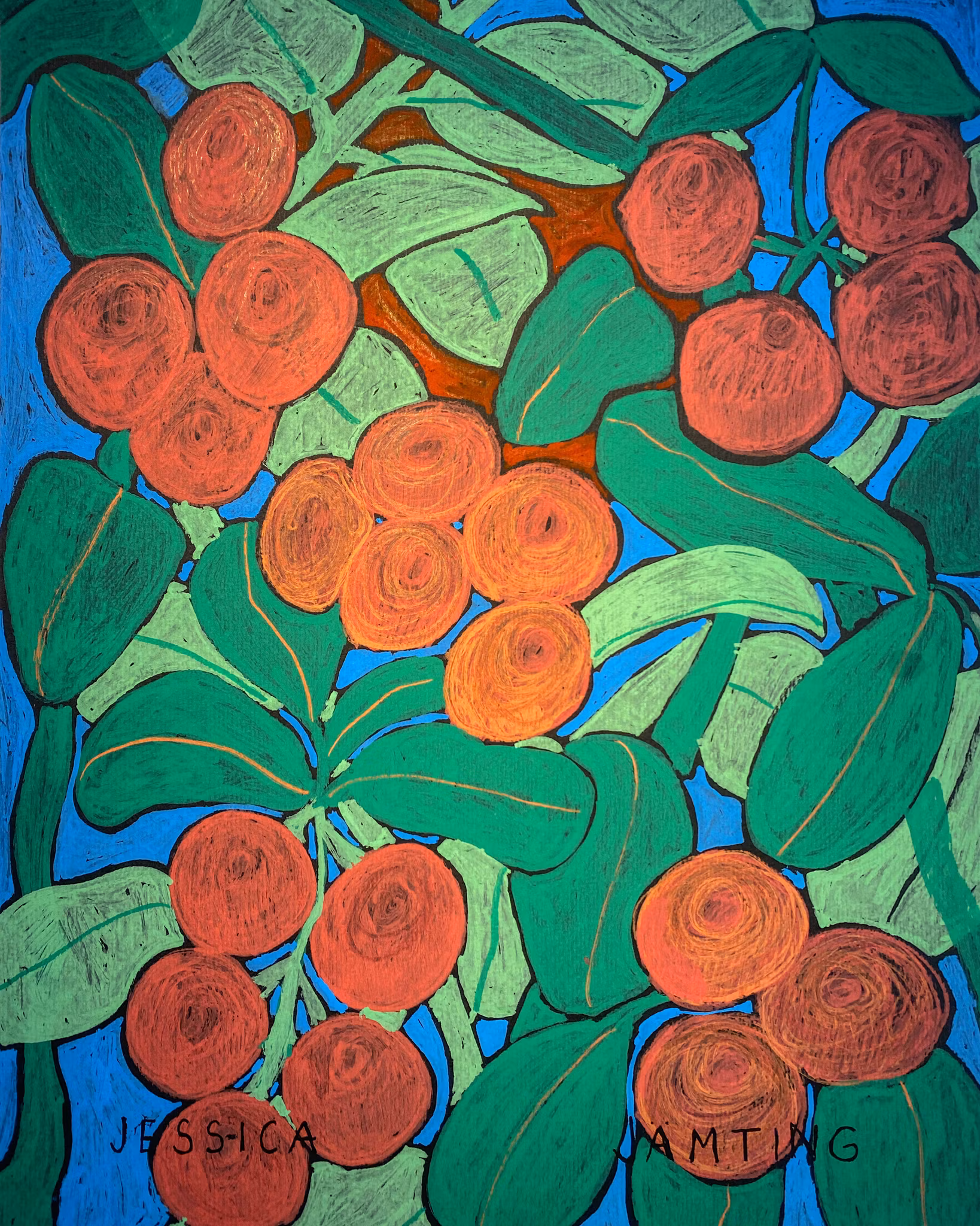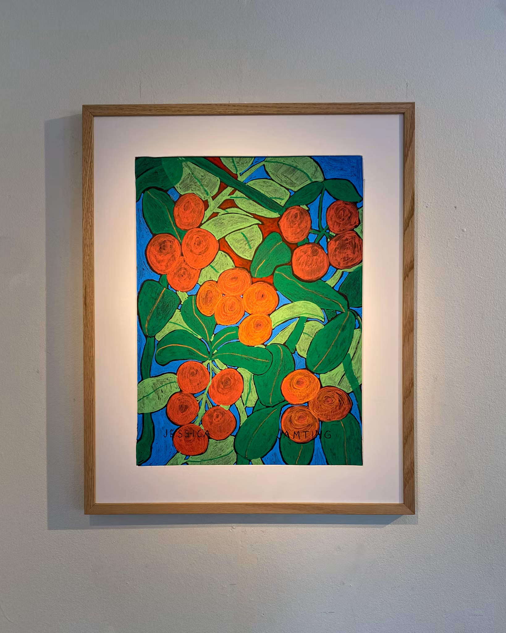 Ett sprakande och livfullt motiv av Jessica Jämting, där röda bär och frodiga gröna blad breder ut sig mot en intensiv blå bakgrund. Färgerna pulserar i harmoni och skapar en rytmisk känsla av nordisk natur i högsäsong – frisk, klar och full av liv.