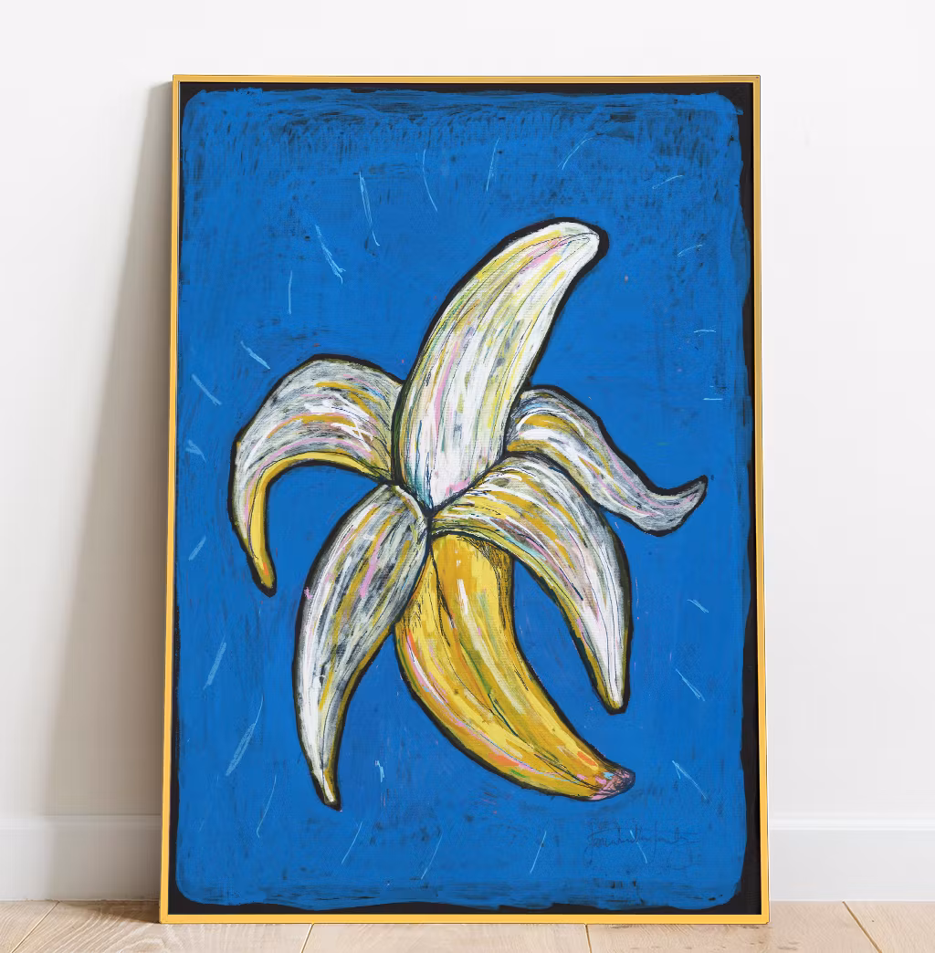 En ikonisk banan i starka färger mot blå bakgrund – enkel, direkt och full av energi. Postern Banana av Jessica Jämting är samtida popkonst när den är som bäst: lekfull, stilren och perfekt som färgklick i vardagsrummet, köket eller ateljén.