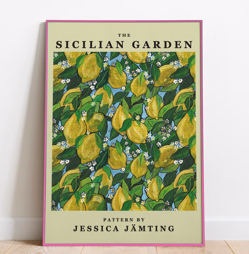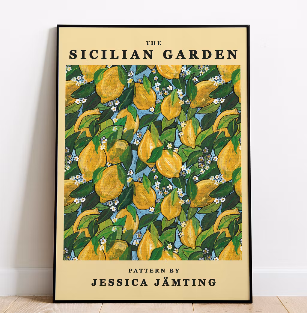 Ta in en bit av Sicilien i ditt hem! Postern The Sicilian Garden är skapad av den svenska konstnären Jessica Jämting och pryds av gyllene citroner bland frodiga gröna blad och små blommor – ett mönster som sprider solsken, fräschör och medelhavskänsla året runt.